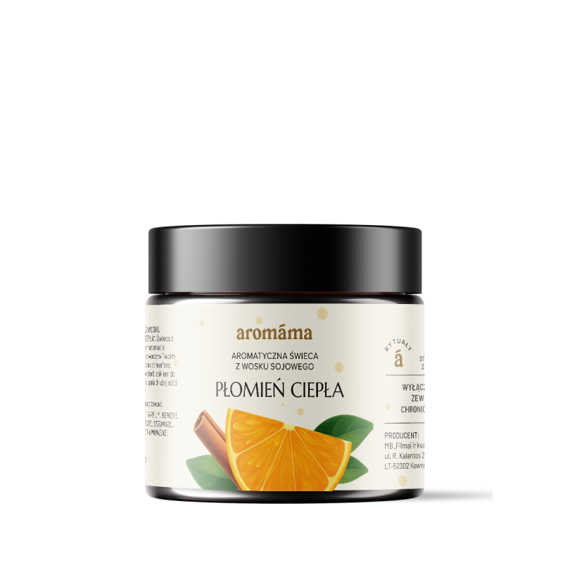 Aromatyczna świeca z wosku sojowego „Płomień Ciepła” o ciepłym aromacie pomarańczy i cynamonu wypełni dom przytulną, świąteczną atmosferą. Zapach subtelnie łączy cytrusową świeżość i korzenną ciepłotę, tworząc wrażenie komfortu, spokoju i ciepłego, nastrojowego wieczoru. Palona świeca zachwyca do 16 godzin, a jej delikatny płomień dodatkowo podkreśla przytulny nastrój. Zaleca się palić ją nie dłużej niż 2 godziny jednorazowo.