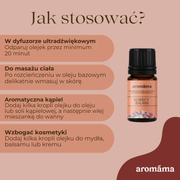 Kąpiel aromaterapeutyczna: wymieszaj 5–6 kropli mieszanki „Harmonia Cyklu” z łyżeczką oleju roślinnego (np. ze słodkich migdałów lub pestek winogron) i wlej do ciepłej wody. Kąpiel przez 10–15 minut pozwoli w pełni rozwinąć zarówno zapach, jak i dobroczynne właściwości olejków.
