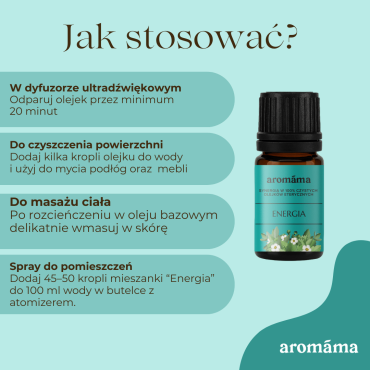 Mieszankę olejków eterycznych ,,Energia’’ odparuj w dyfuzorze. W ciągu dnia dodaj 6–8 kropli mieszanki. Ze względu na intensywny zapach, nie zaleca się stosowania wieczorem ani przed snem – może zakłócać spokojny odpoczynek.
