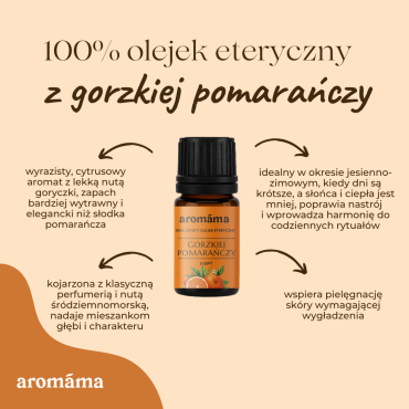 Gorzka pomarańcza to jak promień słońca w mroźny zimowy poranek. Jej aromat jest owocowy, zapraszający do głębokiego wdechu optymizmu i dobrego nastroju. Olejek eteryczny pozyskiwany ze skórek owoców ma aromat wielowarstwowy, wyrafinowany i unikalny: nie tak prosty i banalny jak słodka pomarańcza, nie tak „soczysty” i głęboki jak pomarańcze czerwone, lecz bardziej zielony, elegancko gorzki i lśniący czystą cytrusową świeżością.