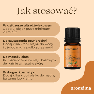 Stosować w dyfuzorze lub kominku zapachowym. Aby wypełnić dom przyjemnym aromatem, dodaj 6–8 kropli olejku do dyfuzora. Olejek z gorzkiej pomarańczy pięknie pachnie samodzielnie lub w połączeniu z innymi olejkami eterycznymi.