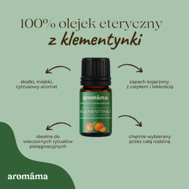 Aromat klementyny rozgrzewa serce, przywołuje wspomnienia i wywołuje uśmiech. W świecie aromaterapii nazywany jest zapachem dzieciństwa, radości życia i uśmiechu. Gdy tylko molekuły olejku klementynowego dotrą do receptorów w nosie, uśmiech staje się nieunikniony – wiemy to z obserwacji naszych klientów na targach i wystawach. Wąchając klementynę, po prostu nie da się nie uśmiechnąć!