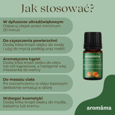 Stosować w dyfuzorze lub kominku zapachowym. Aby wypełnić dom przyjemnym aromatem, dodaj 6–8 kropli olejku eterycznego do dyfuzora. Olejek z klementyny pięknie pachnie samodzielnie, jak również w połączeniu z innymi olejkami eterycznymi.