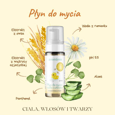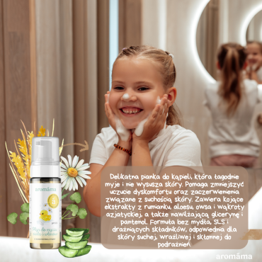 Delikatna, o zrównoważonym składzie pianka dla niemowląt i dzieci. Odpowiednia do codziennego użytku, mycia ciała i włosów. Wzbogacona składnikami łagodzącymi i nawilżającymi: wodą rumiankową, sokiem z aloesu, ekstraktem z owsa i pantenolem.