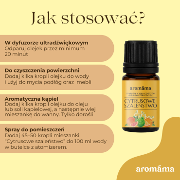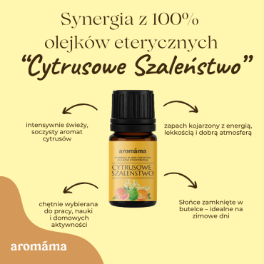 Trudno znaleźć kogoś, komu nie spodobałby się świeży, słoneczny i energetyzujący aromat cytrusów. Odparuj szalone cytrusy w swoim dyfuzorze, przygotuj kąpiel aromaterapeutyczną lub tonizujący i ujędrniający olejek do masażu - do tego idealnie się sprawdzi mieszanka olejków eterycznych "Cytrusowe szaleństwo" ! Aromaterapeuci porównują olejek cytrusowy do słońca – jasna, ciepła cytrusowa energia wnosi do domu dobry nastrój, pomaga energicznie rozpocząć nowy dzień, zapobiega smutkowi w ciemne, długie, jesienne i zimowe wieczory. Mieszanka olejków eterycznych „Cytrusowe szaleństwo" nadaje się do stosowania u niemowląt od 6 miesiąca życia i całej rodziny. Bezpieczny w czasie ciąży i laktacji.