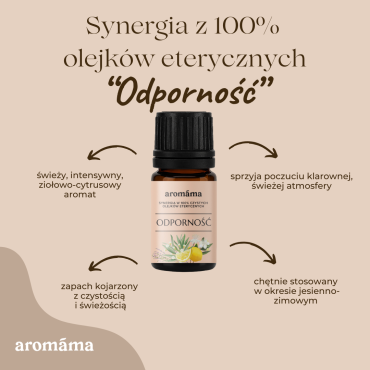 Aromaterapeutyczna synergia świeżego, zapierającego dech w piersiach aromatu, wzmacniającego i oczyszczającego w zimne pory roku. Zawiera doskonałe połączenie olejków eterycznych z rosaliny, eukaliptusa staigeriana, mirtu, tymianku typu linalool i cytryny. Synergia „Odporności” może zostać odparowana w dyfuzorze olejków eterycznych, używanym do nacierania stóp, kąpieli aromaterapeutycznych, saun, kapania na ubrania jako „anioły stróże”. Odpowiedni dla dzieci od 12 miesięcy i całej rodziny. Niezalecany w ciąży, bezpieczny w okresie karmienia piersią.