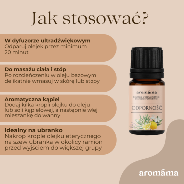 • Odparuj mieszaninę w dyfuzorze olejków eterycznych. W ciągu dnia dodaj 6 do 8 kropli do parownika, w nocy nie więcej niż 3 do 4, ponieważ intensywny aromat może zakłócać spokojny sen. Synergia przyjemnego aromatu „Odporność” doskonale sprawdza się w oczyszczaniu powietrza w pomieszczeniach nie tylko w domu, ale także w biurze, przedszkolu, klasie czy wszędzie tam, gdzie gromadzi się dużo ludzi.