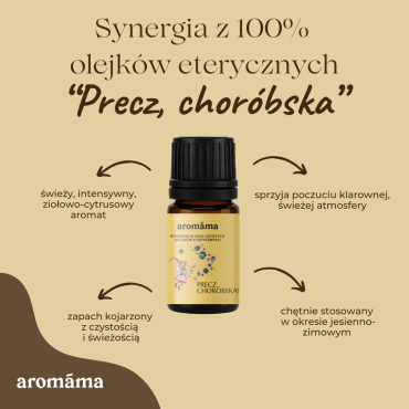 Legendarna, aromatyczna synergia aromámy, która na pewno nie pozostawi Cię obojętnym! Mieszanka niezapomnianego, świeżego, pełnego iskry aromatu jest szczególnie przydatna w zimnych porach roku. Zawarte w kompozycji organiczne olejki z drzewa herbacianego, eukaliptusa radiata i trawy cytrynowej doskonale oczyszczają i aromatyzują powietrze w pomieszczeniach, odpędzają ponure myśli! Stworzony dla tych, którzy mają i używają w domu dyfuzor. "Precz, choróbska!" w sprayu znajdziesz TUTAJ.