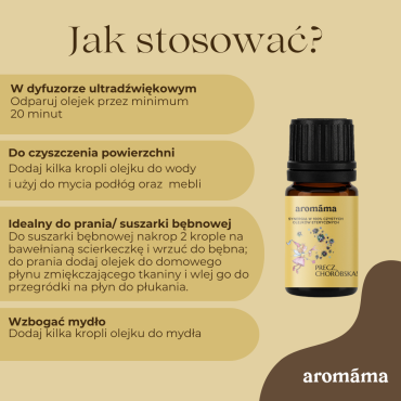 • Odparować w dyfuzorze. Olejki eteryczne wspaniale oczyszczają powietrze i nadają pomieszczeniu przyjemny aromat. W ciągu dnia 6-8 kropli mieszanki olejków eterycznych dodaj do parownika, nie zalecamy odparowywania tej mieszanki na noc, gdyż intensywny aromat może zakłócać spokojny sen.
