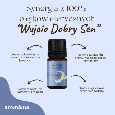 Delikatna, kojąca synergia aromaterapeutyczna „Wujcio Dobry Sen ”, którą kochają mamy i dzieci, pomoże wprowadzić do sypialni Twojego maluszka najpiękniejsze sny i spokojny sen! Mieszanka zawiera najlepsze olejki eteryczne z lawendy, majeranku, rosaliny i sosny, które wspaniale oczyszczają i aromatyzują powietrze w pomieszczeniach. Delikatny aromat nie zakłóca spokojnego snu, dzięki czemu „Wujcio Dobry Sen ” można przez całą noc parować w elektrycznym dyfuzorze olejków eterycznych! Jeśli nie masz dyfuzora, wybierz " Wujcio Dobry Sen " w sprayu. Odpowiedni dla niemowląt od urodzenia i dla całej rodziny! Bezpieczny dla kobiet w ciąży i karmiących.