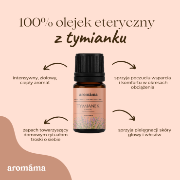 Ciepły, korzenny aromat olejku tymiankowego ekstrahowanego z liści i kwiatów świeżej rośliny. Chemotyp linalolu to najłagodniejszy rodzaj tymianku, odpowiedni dla małych dzieci i osób z wrażliwymi drogami oddechowymi. Najlepsze właściwości tymianku ujawniają się poprzez odparowanie go w dyfuzorze, stosowanie go w saunach, przygotowywanie kąpieli, sprzątanie domu. Olejek tymiankowy jest kompatybilny z olejkami eterycznymi z rosaliny, rumianku, rozmarynu, lawendy, sosny, cytryny, bergamotki, drzewa herbacianego, eukaliptusa radiata. Odpowiedni dla dzieci od 6 miesięcy * i całej rodziny. Nie nadaje się dla kobiet w ciąży! *