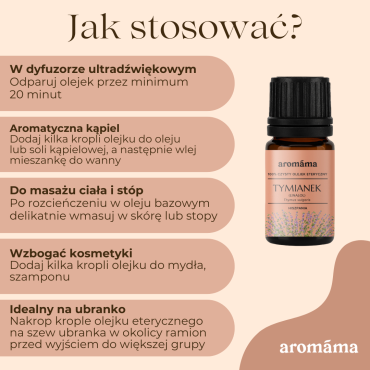 -Odparuj olejek tymiankowy w dyfuzorze - oczyść i aromatyzuj powietrze w pomieszczeniu. Z parownika można inhalować chłodne, wilgotne, aromatyczne opary. W ciągu dnia dodaj 6 - 8 kropli olejku do parownika, na noc - 3 - 4.