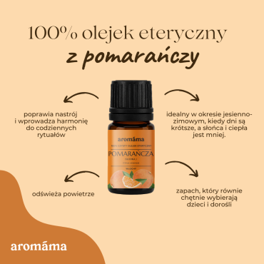Słodka pomarańcza - słoneczny i wesoły aromatyczny olejek eteryczny, prawdziwy wkład w dobry nastrój! Aromaterapeuci żartobliwie nazywają ten olej „płynnym światłem słonecznym”. Dojrzałe owoce cytrusowe pochłaniają mnóstwo światła słonecznego i energii, więc olejki eteryczne pozyskiwane ze skórek cytrusów dodają energii i wypełniają dom przytulnością - szczególnie nadają się do odparowania w czasie zimną porę roku, kiedy jest brak światła słonecznego i ciepła. Pomarańczowy olejek eteryczny dobrze komponuje się z olejkami eterycznymi z cytryny, grejpfruta, neroli, lawendy, mięty pieprzowej, bergamotki, ylang-ylang. Odpowiedni dla dzieci od 6 miesiąca życia (w dyfuzorze, do sprzątania domu) i dla całej rodziny. Bezpieczny w czasie ciąży i laktacji.