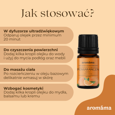 • Odparuj pomarańczowy olejek eteryczny w dyfuzorze. Dodaj 6-8 kropli olejku do dyfuzora w ciągu dnia, 3-4 krople wieczorem i koniecznie wymieszaj z „spokojniejszymi”, nietonizującymi olejkami eterycznymi: bergamotką, mandarynką, lawendą. Nie zalecamy parowania olejku pomarańczowego w nocy, ponieważ on tonizuje, aktywuje i może niekorzystnie wpływać na jakość snu. Osobom, którym trudno się obudzić i rozpocząć dzień, zdecydowanie polecamy rano odparować olejek pomarańczowy.