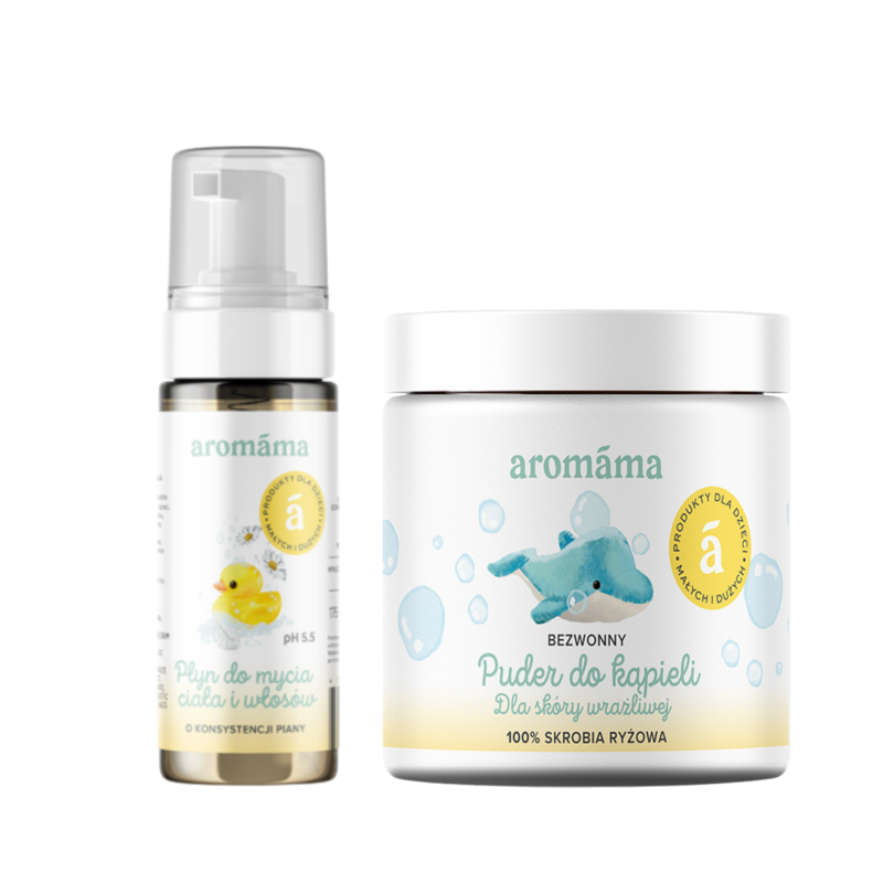 Zadbaj o delikatną, wrażliwą skórę codziennym rytuałem kąpielowym. Zestaw łączy piankę do mycia ciała i włosów, łagodnie oczyszczającą i nawilżającą dzięki wodzie rumiankowej, sokowi z aloesu, ekstraktom z owsa i pantenolowi, z bezzapachowym pudrem do kąpieli z 100% skorup ryżowych, który zmiękcza i otula skórę ochronną warstwą.