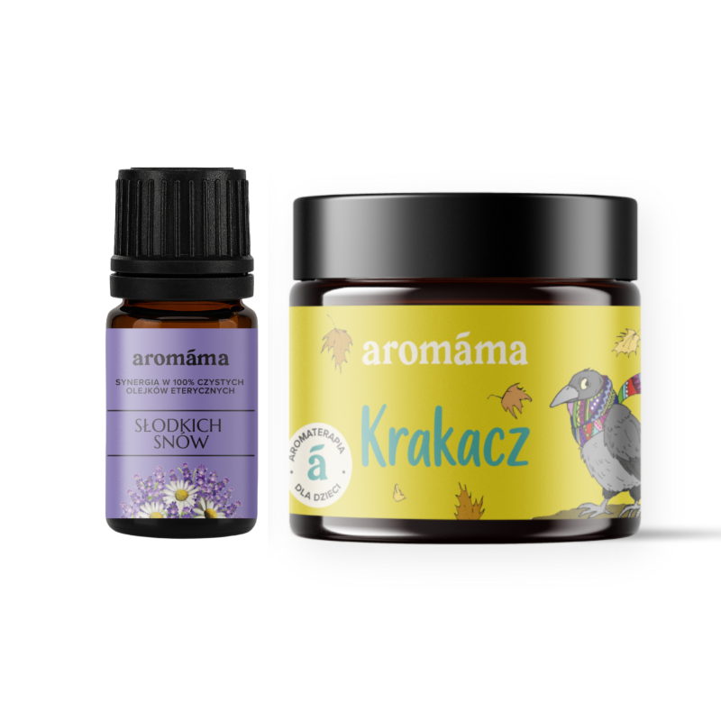 - Mieszanka olejków eterycznych "Słodkich Snów" (od urodzenia) - na lepszy sen i świetny kompan podczas przezięnień, zwłaszcza przy kaszlu w duecie z balsamem "Krakacz". Samą mieszankę "Słodkich Snów" można jeszcze dodać do dyfuzora, nakrpić brzegi poduszki przed spaniem (aby skóra nie miała bezpośredniego kontakty z pokropionym materiałem).